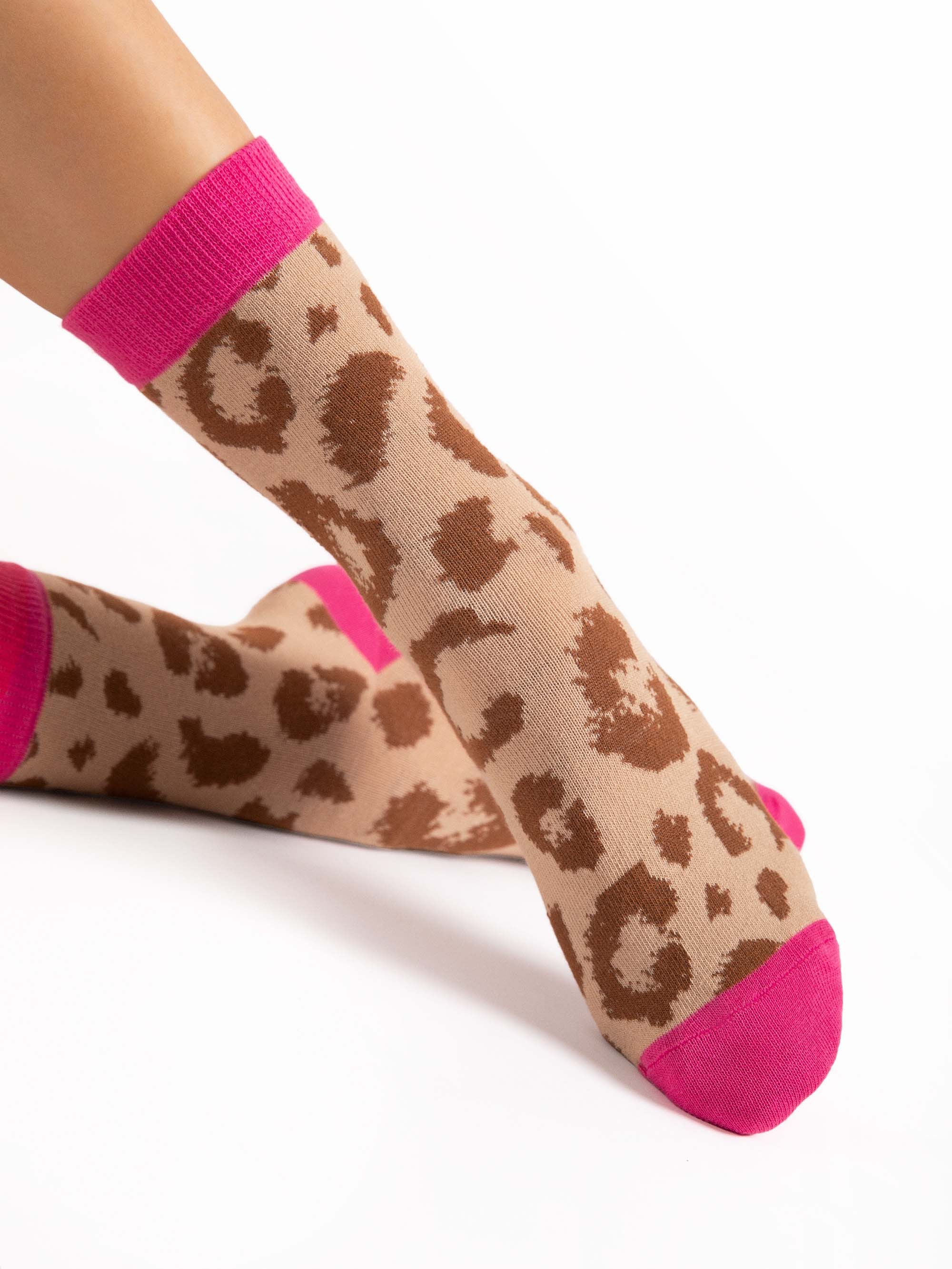 Różowy ściągacz kontrastujący z subtelnym, zwierzęcym wzorem w czarnym kolorze, przyciągnie niejedno spojrzenie. Jeśli lubisz robić pioronujące wrażenie, wybierz skarpetki Amalia w wersji total pink.